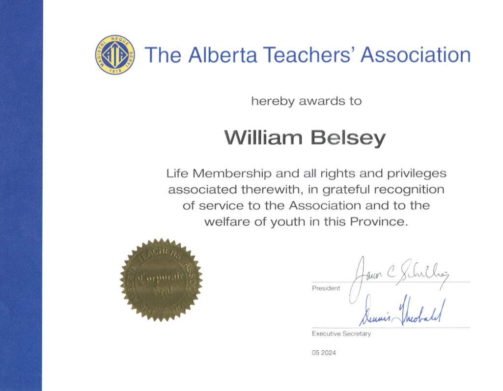 In June 2015, Mr. Belsey was chosen as the “Teacher of the Year” by the Alberta Teachers’ Association Educational Technology Council.